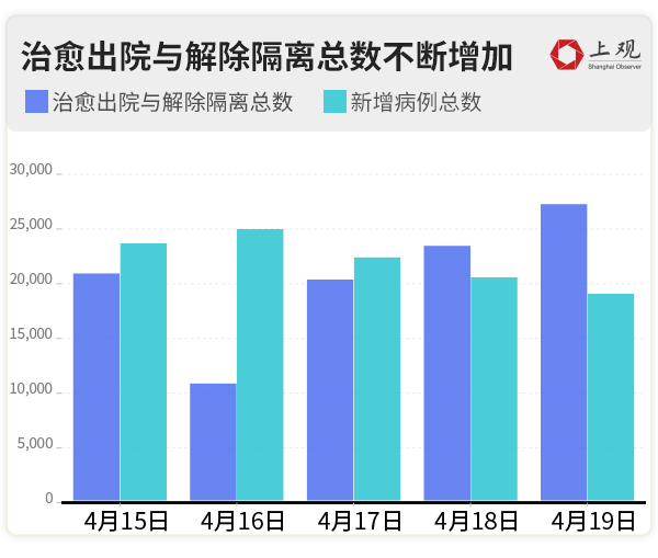 在4月15日,治愈出院与解除隔离的总数超过2万人;在4月18日超过当日新增病例总数,而4月19日更是比当日新增病例总数多出8192人。