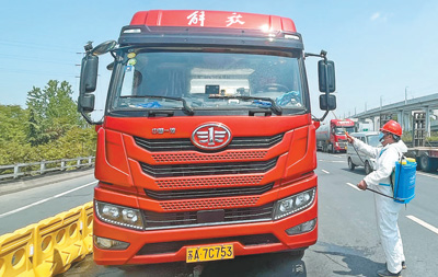 4月21日,郭辉驾驶货车返回南京后,防疫工作人员对货车进行消毒。