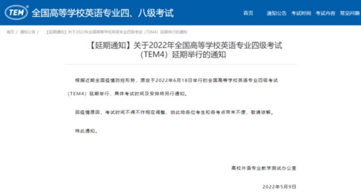 【延期通知】关于2022年全国高等学校英语专业四级考试(TEM4)延期举行的通知