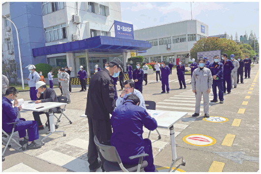 在位于上海市金山区的巴斯夫护理化学品(上海)有限公司工厂内,工人在做抗原检测(五月十二日摄)。本报通联照片