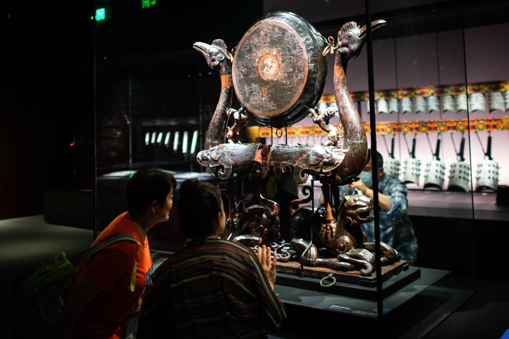 5月12日,在湖北省博物馆,参观者观看展出的彩绘漆木虎座鸟架鼓。新华社记者 肖艺九 摄