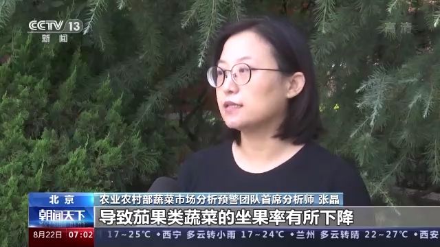 农业农村部蔬菜市场分析预警团队首席分析师 张晶:南方的高温,局部地区的蔬菜生长来说,需要增加遮阳等措施使得成长,使得生产的成本也略有偏高,对于北方产区来说,是由于前期持续的降水,导致茄果类蔬菜的坐果率有所下降,对于鲜嫩的叶类菜来说,它的腐烂程度会比较高,在运输过程当中损耗率会比较大,所以北方的菜价也是有所上涨的。