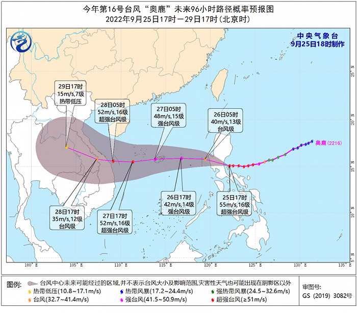 预计,“奥鹿”将以每小时25公里左右的速度向西偏北方向移动,将于今天晚上在菲律宾吕宋岛东部沿海登陆(48~55米/秒,15~16级,强台风级或超强台风级),今天夜间穿过吕宋岛,强度有所减弱,26日早晨到上午进入南海中东部海域,之后向偏西方向移动,逐渐向越南东部沿海靠近,强度还将有所加强,28日早晨到上午在越南东部沿海登陆(48~52米/秒,15~16级,强台风级或超强台风级),登陆后强度快速减弱。中央气象台9月25日上午发布台风蓝色预警。