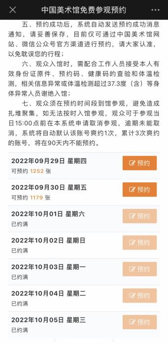 除了博物馆,部分美术馆预约也相当火热。中国美术馆10月1日至5日目前已全部约满。正在举办“文明的印记——敦煌艺术大展”的北京民生现代美术馆的预约小程序显示,10月1日至7日已全部约满,假期特别推出的1日至3日的三天夜间专场活动也已约满。记者咨询的工作人员表示,白天场提供一定的现场预约名额,但名额有限,需尽早到场。