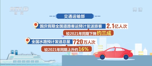 数据二:2.1亿人次。交通运输部介绍,国庆假期,全国道路客运预计发送旅客2.1亿人次,较2021年同期下降约三成。全国水路预计发送总量720万人次,较2021年同期上升约16%。今年国庆假期公众出行主要以旅游、探亲为主,小客车自驾游、周边游比例相对较高,跨省长距离出行较往年减少,大中城市周边公路网高峰时段会出现局部拥堵,通行压力较大。而且交通运输部表示,今年国庆节假期,全国收费公路继续对7座及7座以下小型客车免收车辆通行费,具体时段为10月1日0点到10月7日24点。