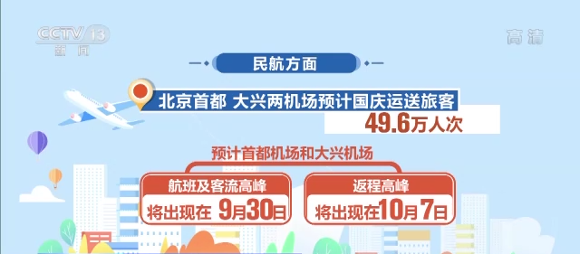 数据三:49.6万人次。这是民航方面的数据。北京首都、大兴两机场预计国庆运送旅客49.6万人次。根据目前各航空公司航班计划预测,首都机场和大兴机场航班及客流高峰将出现在9月30日,返程高峰将出现在10月7日。