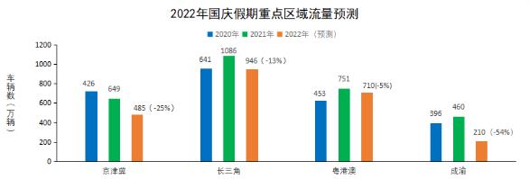 假日期间,预计京津冀、长三角、粤港澳大湾区和成渝地区双城经济圈“四极”区域高速公路同比2021年下降20%~22%左右。其中,受疫情影响,京津冀和成渝区域流量同比皆大幅下降,降幅分别为25%和54%左右,长三角、粤港澳地区流量分别下降13%、5%左右。