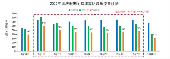 (一)京津冀区域。目前,天津疫情还未得到全面控制,部分区域实施静态管理。受疫情影响,国庆期间京津冀区域流量同比将有所下降。预计假期京津冀区域高速公路日均流量约485万辆,同比2021年(649万辆)下降25%左右。其中,日均客车流量为412万辆左右,日均货车流量为73万辆左右。假期前一天、假期第一天高速公路进出城区主要通道的出城方向,假期最后一天的进城方向的收费站、路段会出现车流集中甚至拥堵情况;通往热门景点的收费站以及热门景点周边普通公路高峰时段将出现短时车流集中情况。