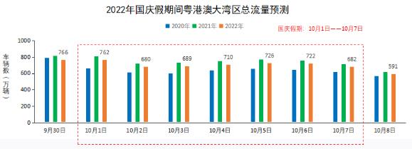 (三)粤港澳大湾区。目前,广东省防疫形势基本稳定,预计高速公路日均流量约710万辆,同比2021年(751万辆)下降5%左右。其中,日均客车流量为602万辆左右,占比85%,日均货车流量为108万辆左右。预计国庆节前一天(9月30日)下午,以广州、深圳等城市为中心的出程车流开始出现;10月1日是出行最高峰;10月2日至3日,车流将有所回落;10月4日至5日,新一波的短途出行车流有可能出现,并开始叠加省际返程车流;假期后期(6日至7日)中心城市进城方向、省际省内主干道返程车流会增加。