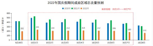 (四)成渝地区。目前,四川省疫情防控形势总体可控,平稳向好,尤其是成都市已取得阶段性成果,但提倡就地过节以及较为严格的跨省跨市疫情管控措施将较大影响公众出行意愿,出行需求相比中秋虽有所反弹,总体仍相对较低。预计成渝区域假期高速公路日均流量约为210万辆,同比2021年(460万辆)下降54%左右。其中,日均客车流量为173万辆左右,日均货车流量为37万辆左右。国庆假期短途短期出游特征明显,预计公众跨省长途旅游、探亲等出行需求将进一步降低;市内出行需求将有所增长,以城市周边短途短期的休闲游、亲子游和健身游为主。