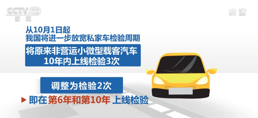从今天起,我国将进一步优化调整非营运小微型载客汽车也就是私家车,以及摩托车的检验周期。将原来非营运小微型载客汽车10年内上线检验3次,也就是在第6年、第8年、第10年检验,调整为检验两次,即在第6年和第10年上线检验;摩托车从今年10月1日起,也就是在第6年和第10年上线检验2次即可。对于超过10年的非营运小微型载客汽车和摩托车,今后将统一调整为每年上线检验1次。不过,在10年内,这两类车辆仍需每2年向公安机关申领1次检验合格标志。