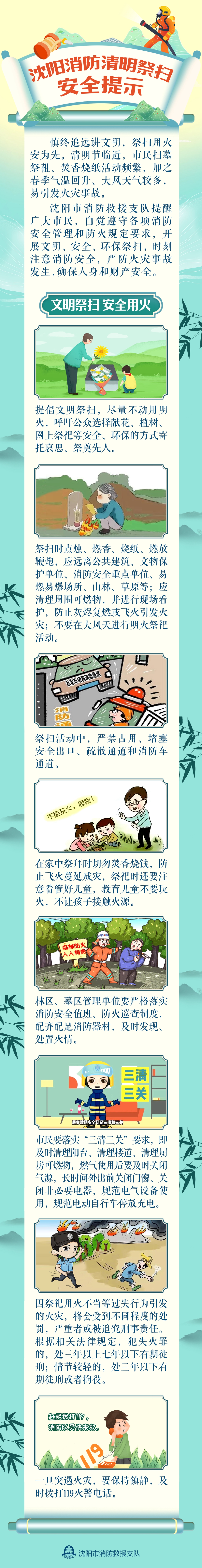 沈阳市消防救援支队提醒广大市民,自觉遵守各项消防安全管理和防火规定要求,开展文明、安全、环保祭扫,时刻注意消防安全,严防火灾事故发生,确保人身和财产安全。