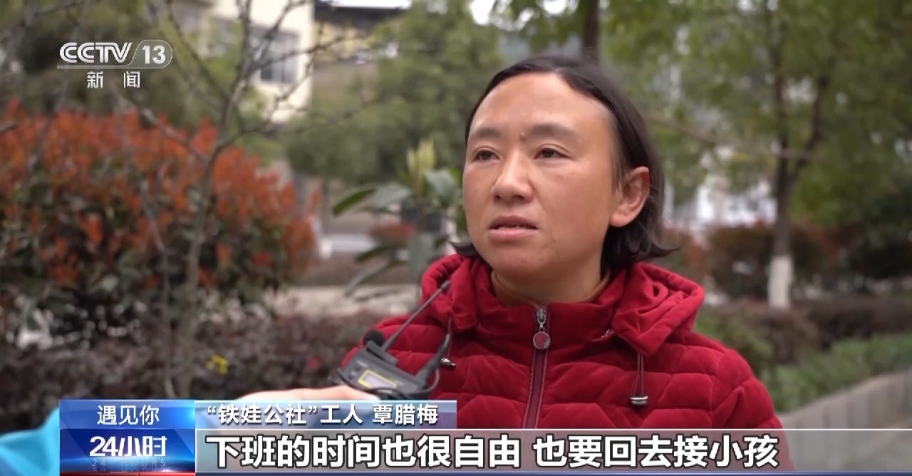 “铁娃公社”工人 覃腊梅:像我们带小孩的话,早上要把小孩送去上学,才能上班。下班的时间也很自由,也要回去接小孩。对于我们还真是蛮好的。