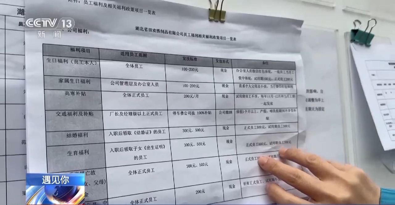 在“铁娃公社”的工厂公示栏中,贴着福利待遇的公示。上面不仅有法定假期,还有员工生日福利、家属福利、子女升学福利等。