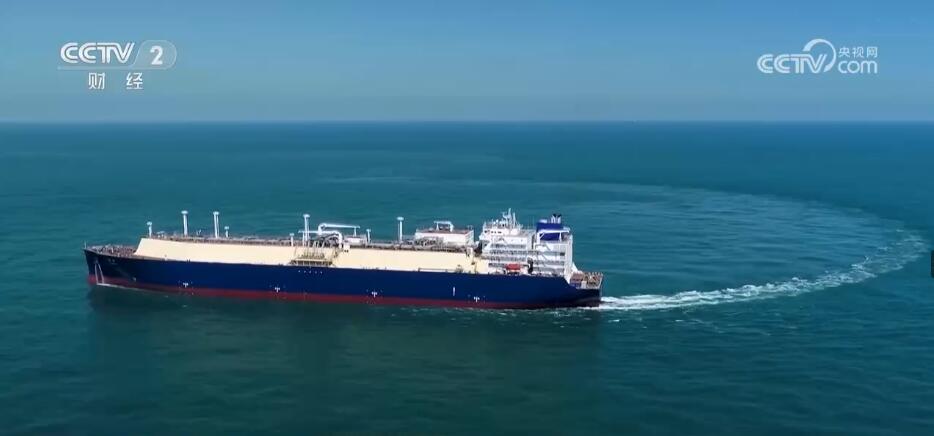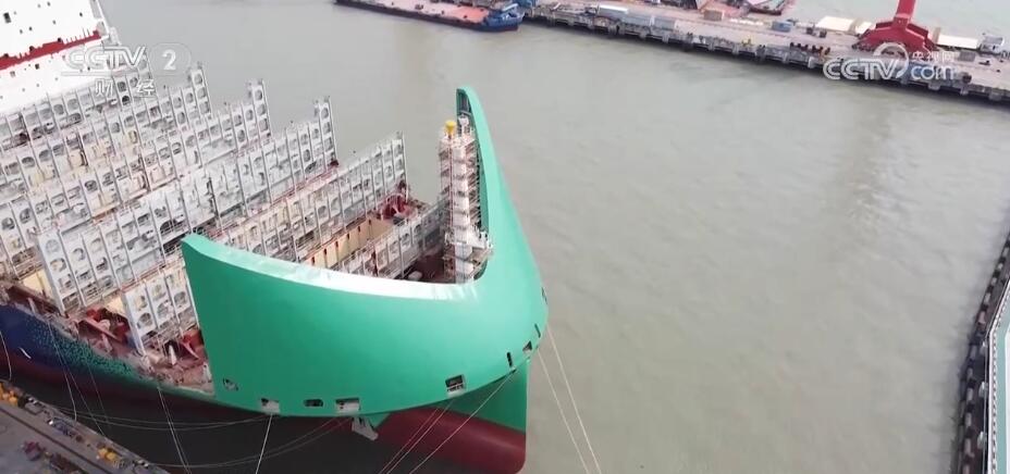 总台央视记者 孟湛东:我现在是在中国船舶沪东中华造船厂的一艘13000箱的双燃料集装箱船上,这艘船除了使用传统的石油燃料之外,还引入了液化天然气,可以直接降低28%以上的温室气体的排放。除此之外,在船头还有一个独特的设计,各位可以看到一个绿色的防风罩,工人们亲切地称它们叫做“绿头怪”,这样的设计可以让船舶在正常行驶当中降低2%左右的燃料消耗。