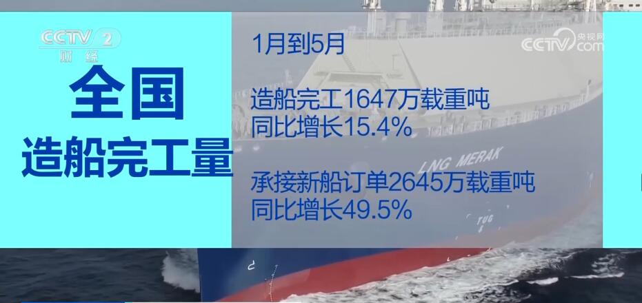 今年1—5月,全国造船完工1647万载重吨,同比增长15.4%;承接新船订单2645万载重吨,同比增长49.5%。5月底,手持船舶订单11799万载重吨,同比增长15.5%。绿色船舶理念正逐步贯穿船舶的设计建造全过程,成为中国造船业一张响亮的“名片”。