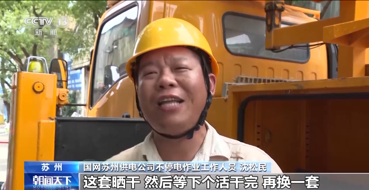国网苏州供电公司不停电作业工作人员 沈松民:我们有备用的(工作服),都拿过来再换一套。这套晒干,然后等下个活干完,再换一套。