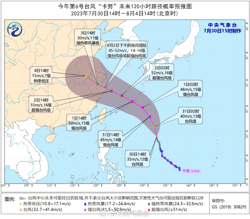 “卡努”在菲律宾以东洋面生成,30日加强为台风级。30日17时,其中心位于琉球群岛那霸市东南约850公里的洋面,预计以每小时20公里的速度向北偏西移动,31日转向西北移动,强度逐渐增强,最强可达强台风级或超强台风级(50~55米/秒,15~16级),8月1日移入东海,向华东沿海靠近。
