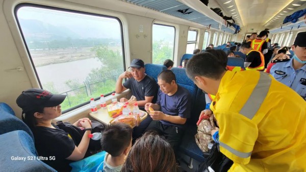 在转运K1178次列车旅客过程中,铁路部门增派32名值乘人员,为旅客备足食物和水,全力做好服务保障工作。