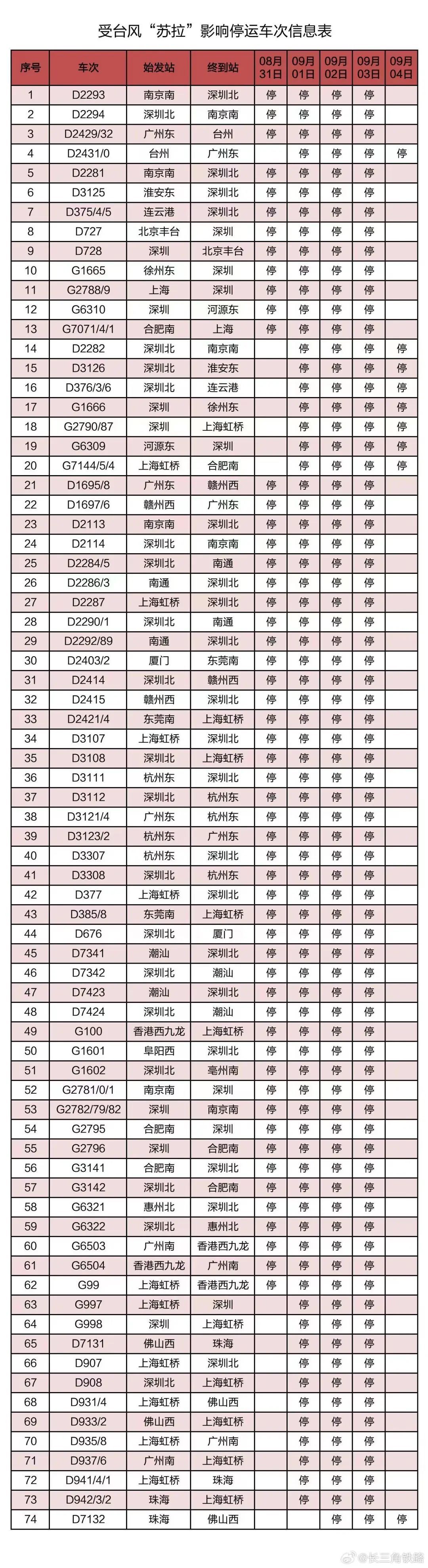 据中国铁路上海局集团公司消息,受第9号台风“苏拉”影响,为确保列车运行安全,铁路部门计划对杭深线、京港高铁、广深城际、广深港高铁、穗深城际、京九线等线路运行的部分列车采取停运措施。截至30日17时30分,计划停运8月31日至9月6日间共121趟旅客列车:其中停运动车组列车74趟,停运普速列车47趟。