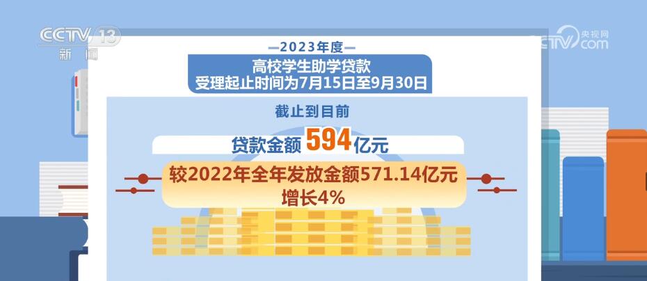 教育部全国资助管理中心有关负责人介绍,2023年度高校新生助学贷款受理起止时间为7月15日至9月30日,截止到目前,全国申请助学贷款学生已达581万人,贷款金额594亿元,较2022年全年发放金额571.14亿元,增长4%。
