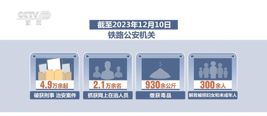 截至2023年12月10日,铁路公安机关共破获刑事、治安案件4.9万余起,抓获网上在逃人员2.1万余名,缴获毒品930余公斤,解救被拐妇女和未成年人300余人。