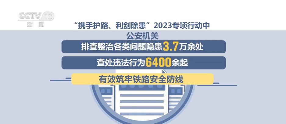 为推动问题隐患源头治理、综合治理,铁路公安机关协同铁路沿线有关地方、部门和企业共同开展“携手护路、利剑除患”2023专项行动。行动中,公安机关排查整治各类问题隐患3.7万余处,查处违法行为6400余起,有效筑牢了铁路安全防线。