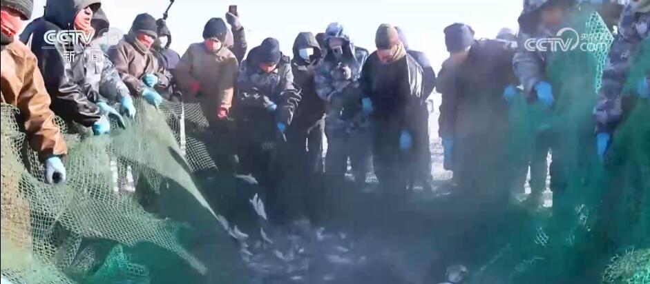 在克什克腾旗达里湖现场,人工凿冰、冰下走网,冬捕队员在作业时选用5公分网眼,这样捕鱼时就能漏掉小鱼。马拉绞盘将大网拖拽出网口,满载鱼儿的渔网慢慢地从湖水中出来,游客们感受丰收的喜悦。