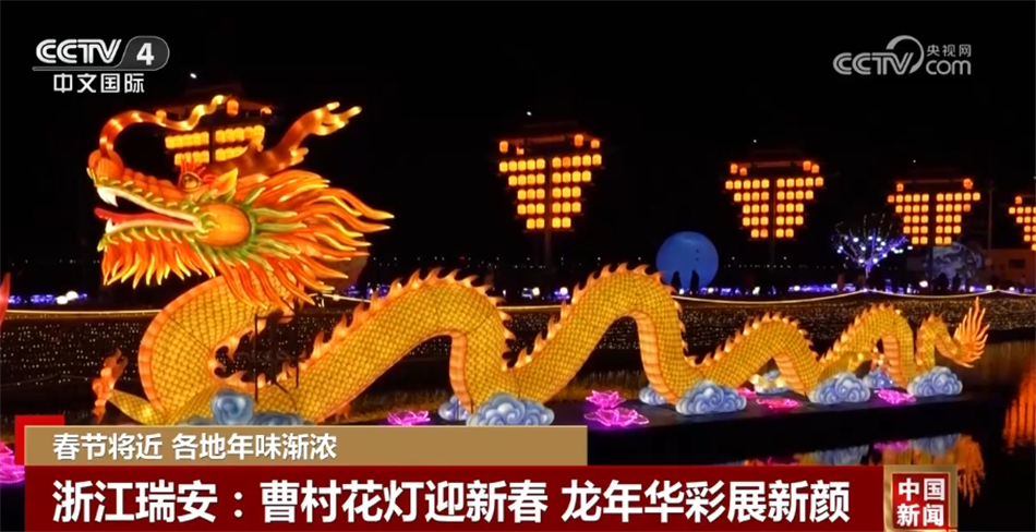 走进浙江温州瑞安市曹村镇,各式花灯一步一景,令游客目不暇接。一条长约10米的“金龙”盘桓在水面之上,龙头微微摆动,龙身周边祥云围绕、栩栩如生。曹村镇有着800多年的花灯文化,此次灯会有大型主题灯组40余个,为居民、游客带来了一场视觉盛宴。