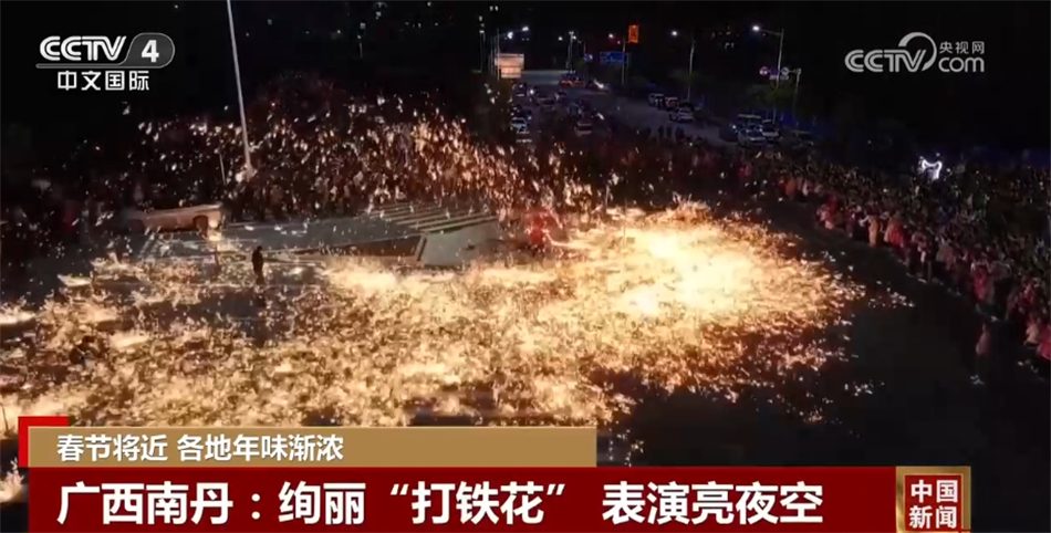 在广西河池南丹县,一场绚烂的“打铁花”非遗表演点亮夜空。一勺勺滚烫的铁水在匠人的击打下化作一朵朵铁花璀璨绽放,市民纷纷拿出手机拍照打卡,记录这美丽的瞬间。