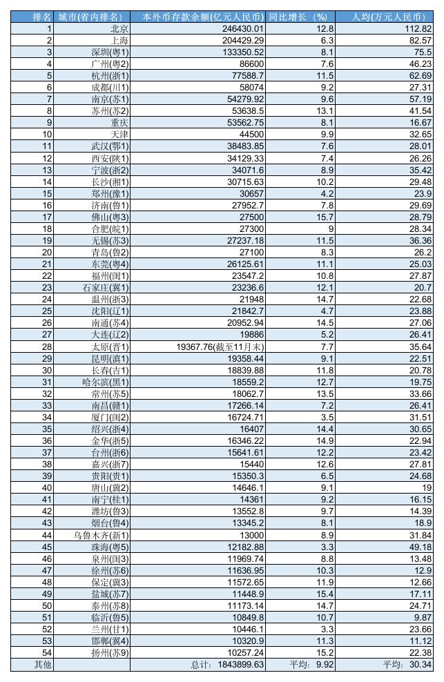 去年全国金融机构本外币存款余额增势较前年有所放缓,也体现在万亿级资金城市群体身上。一位长期从事金融市场研究的人士告诉记者,去年与股票基金相关的非银存款及与海外投资相关的外币存款降幅较大,对资金总量增速的拖累明显。在这方面,金融市场发达和外商投资较多的一、二线城市受到的影响更大,三、四线城市所受影响反而更小。但去年北京的本外币存款增速较高,跟北京作为央行总部所在城市的金融中心势能有较大关系。