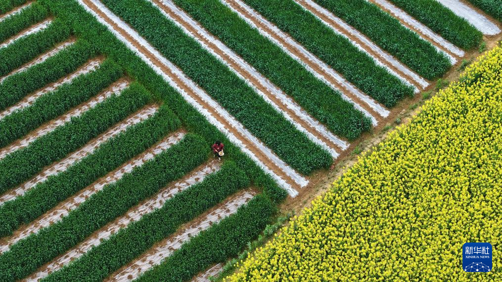3月17日,在四川省阆中市白溪村,村民在给麦田里套栽的玉米苗施肥(无人机照片)。