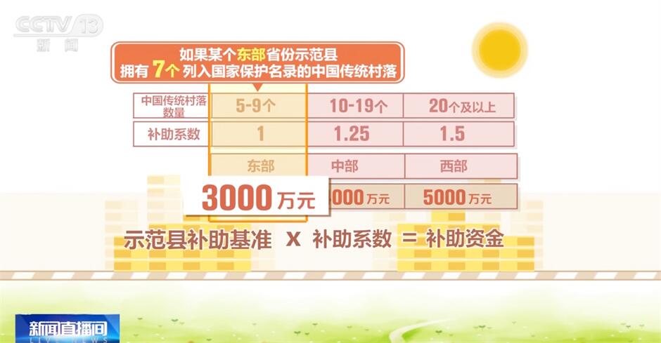 根据规定,中央财政对传统村落集中连片保护利用示范县予以定额奖补,其中东、中、西部示范县补助基准分别为3000万元、4000万元、5000万元。同时,根据示范县拥有中国传统村落数量情况赋予相应奖补系数,拥有5—9个、10—19个、20个及以上中国传统村落的示范县补助系数分别为1、1.25、1.5。每个示范县的补助资金为相应的补助基准乘以补助系数。举个例子,如果某个东部省份示范县拥有7个列入国家保护名录的中国传统村落,中央财政将对这个示范县进行3000万元奖补。