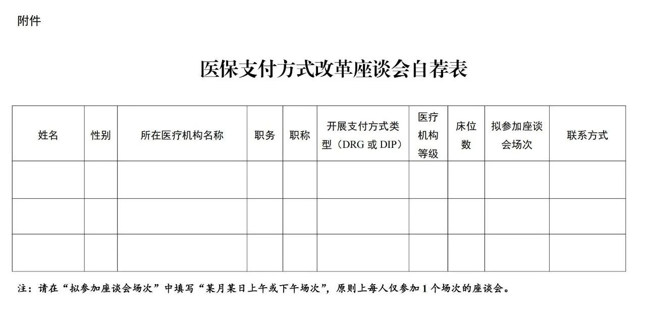 4月15日晚,国家医保局办公室发布《关于征集医保支付方式改革座谈会参会人员的公告》,征集目前在医疗机构工作,身份为医疗机构管理者、医保办负责同志、一线医护人员参加座谈会,对参会人员的要求包括其所在医疗机构实施DRG/DIP付费一年以上,反映的情况和意见具有较强代表性等方面。
