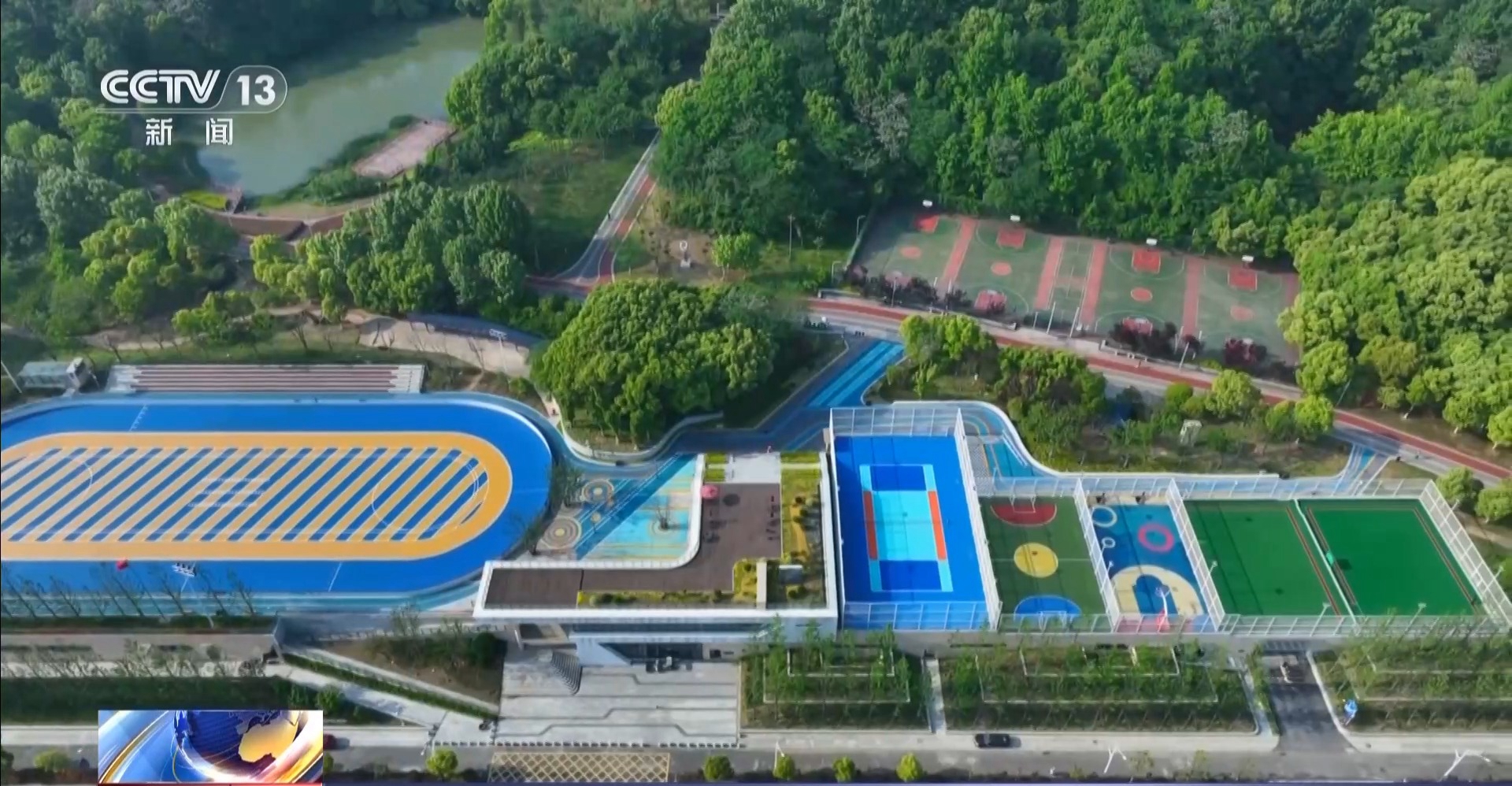 除此之外,围绕着整个公园自然山体的外侧,还铺设了红色的塑胶跑道,公园的东南角还有篮球场、足球场、运动广场,满足市民的健身需求。