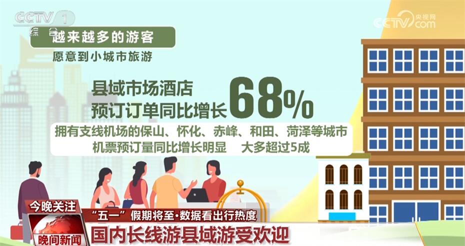国内游方面,各大旅游平台的预订数据显示,今年“五一”假期,国内长线游订单占比超一半,北京、上海、重庆、杭州、成都、南京、西安、武汉、广州、长沙是“五一”假期的热门旅游目的地。也有越来越多的游客愿意到小城市旅游,县域市场酒店预订订单同比增长68%。拥有支线机场的保山、怀化、赤峰、和田、菏泽等城市机票预订量同比增长明显,大多超过五成。