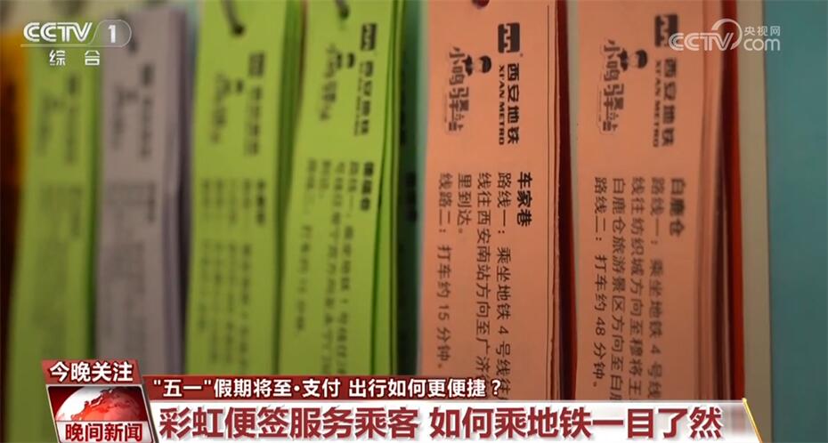这里是西安地铁五路口站,在站点的一面墙上,色彩鲜艳的“彩虹指引条”引人注目。地铁工作人员介绍,他们刚刚更新了去往西安市各大旅游景点和客运交通枢纽的多种出行路线,这些“彩虹”指引条一张指引一个地点,被放置在车站每个出入口和爱心服务台,乘客们可以自行带走。