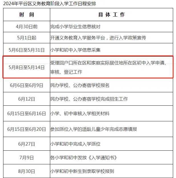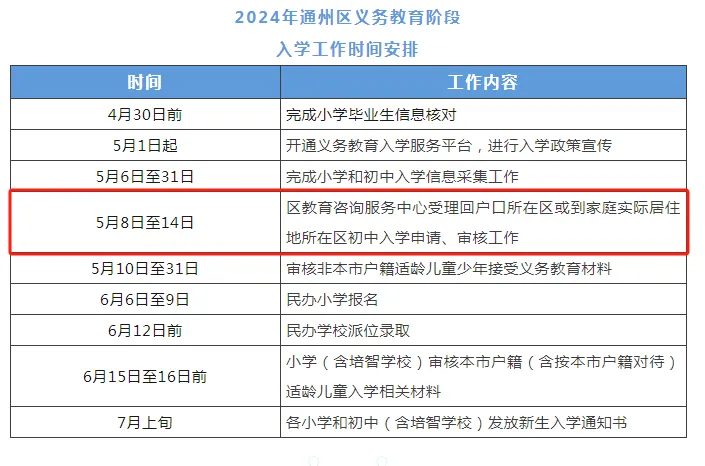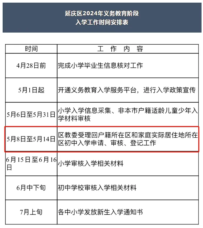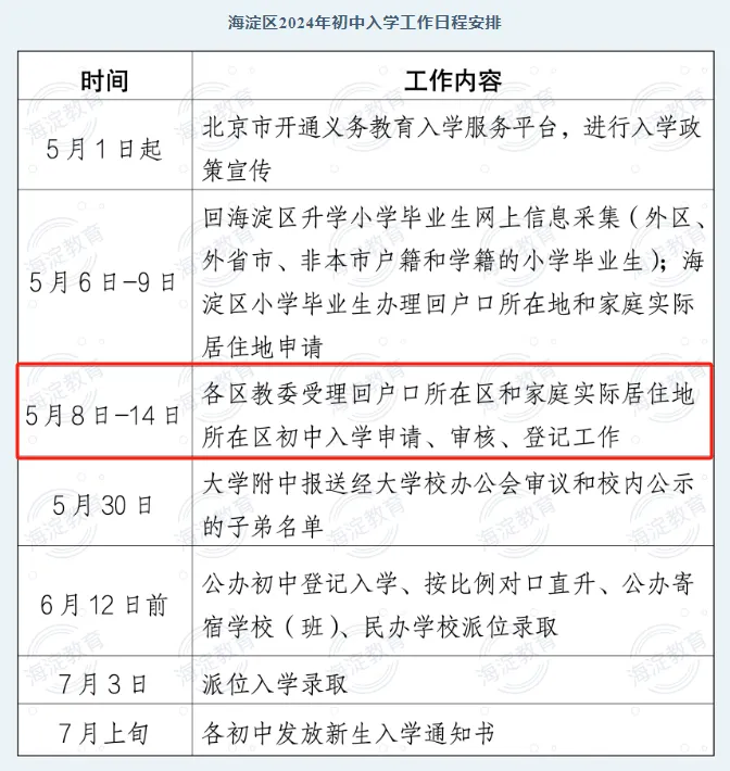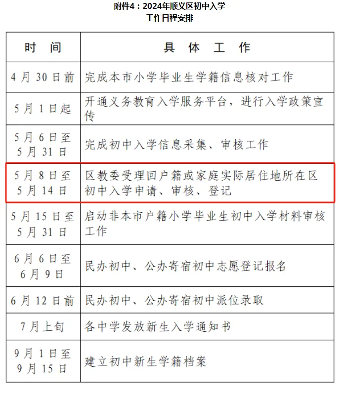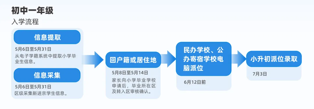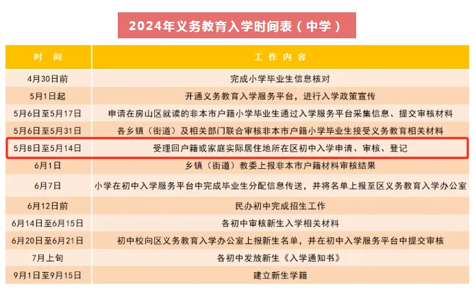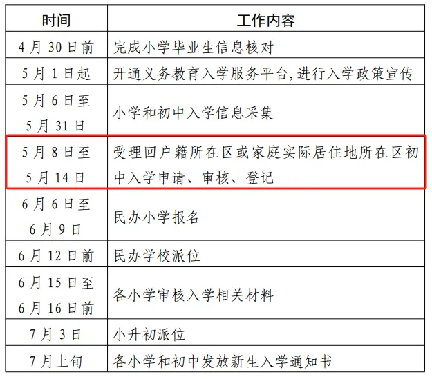 按照市教委的统一安排,5月8日至5月14日各区受理回户籍或家庭实际居住地所在区初中入学的申请、审核、登记工作。学生就读小学需为学生从初中入学服务系统中提交申请,转出区审核通过后,家长可到入学区办理相关手续。请注意办理时间,错过将影响入学。