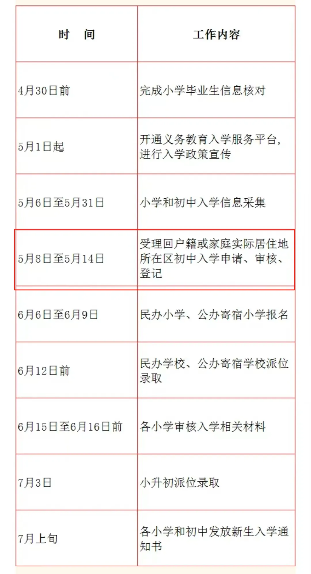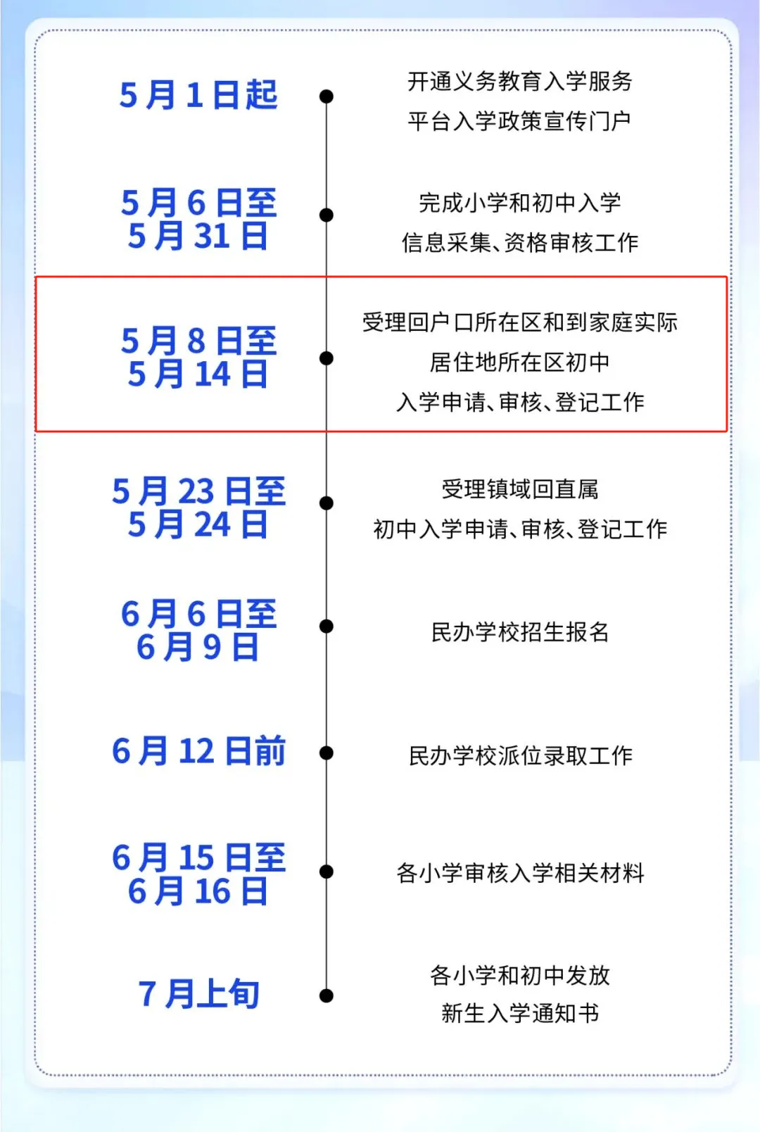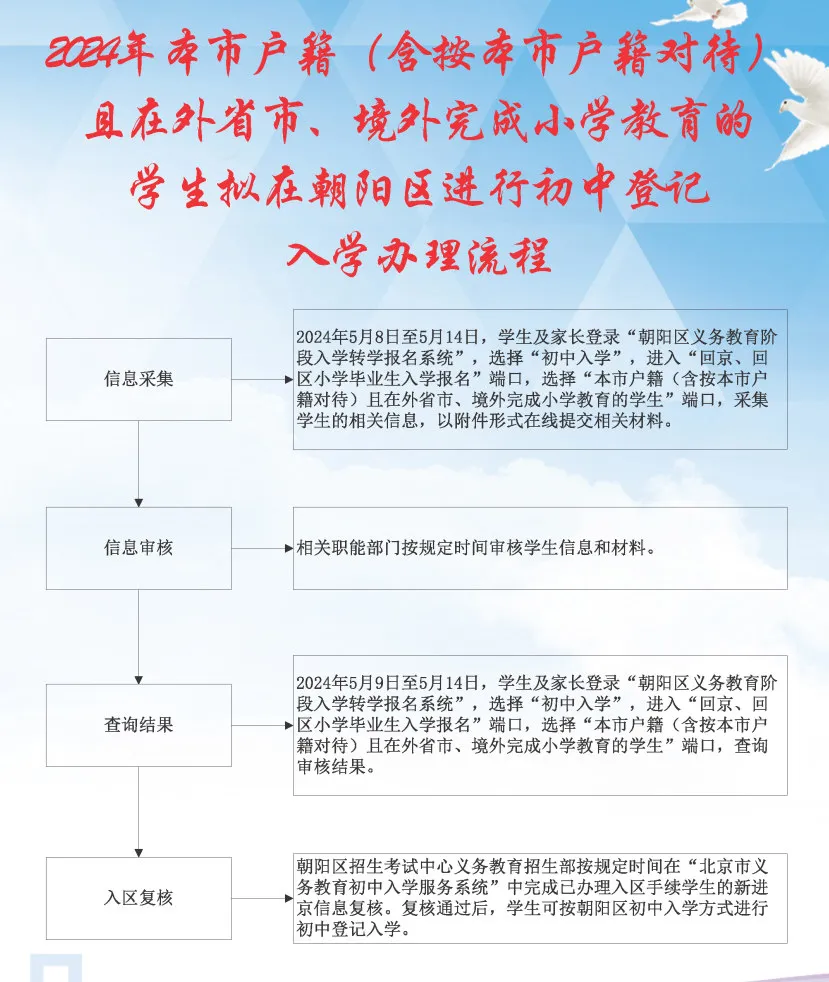 按照市教委的统一安排,5月8日至5月14日各区受理回户籍或家庭实际居住地所在区初中入学的申请、审核、登记工作。学生就读小学需为学生从初中入学服务系统中提交申请,转出区审核通过后,家长可到入学区办理相关手续。请注意办理时间,错过将影响入学。
