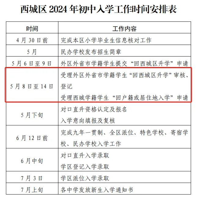 外省市小学六年级应届毕业生回西城区初中入学:实际居住在西城区,学生和法定监护人(父母至少一方)均为西城区户籍。