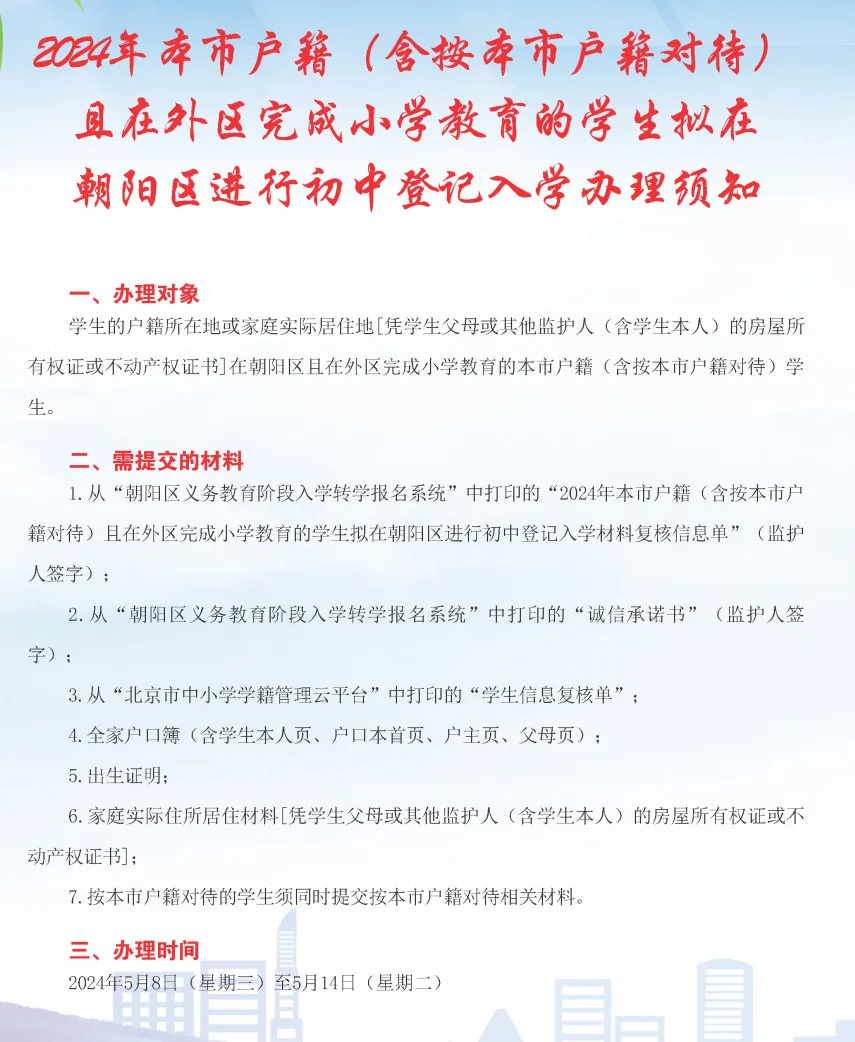 央视网消息:据“北京发布”消息,各位家长注意了!5月8日-14日,各区教委将受理回户籍或家庭实际居住地所在区初中入学申请、审核、登记。