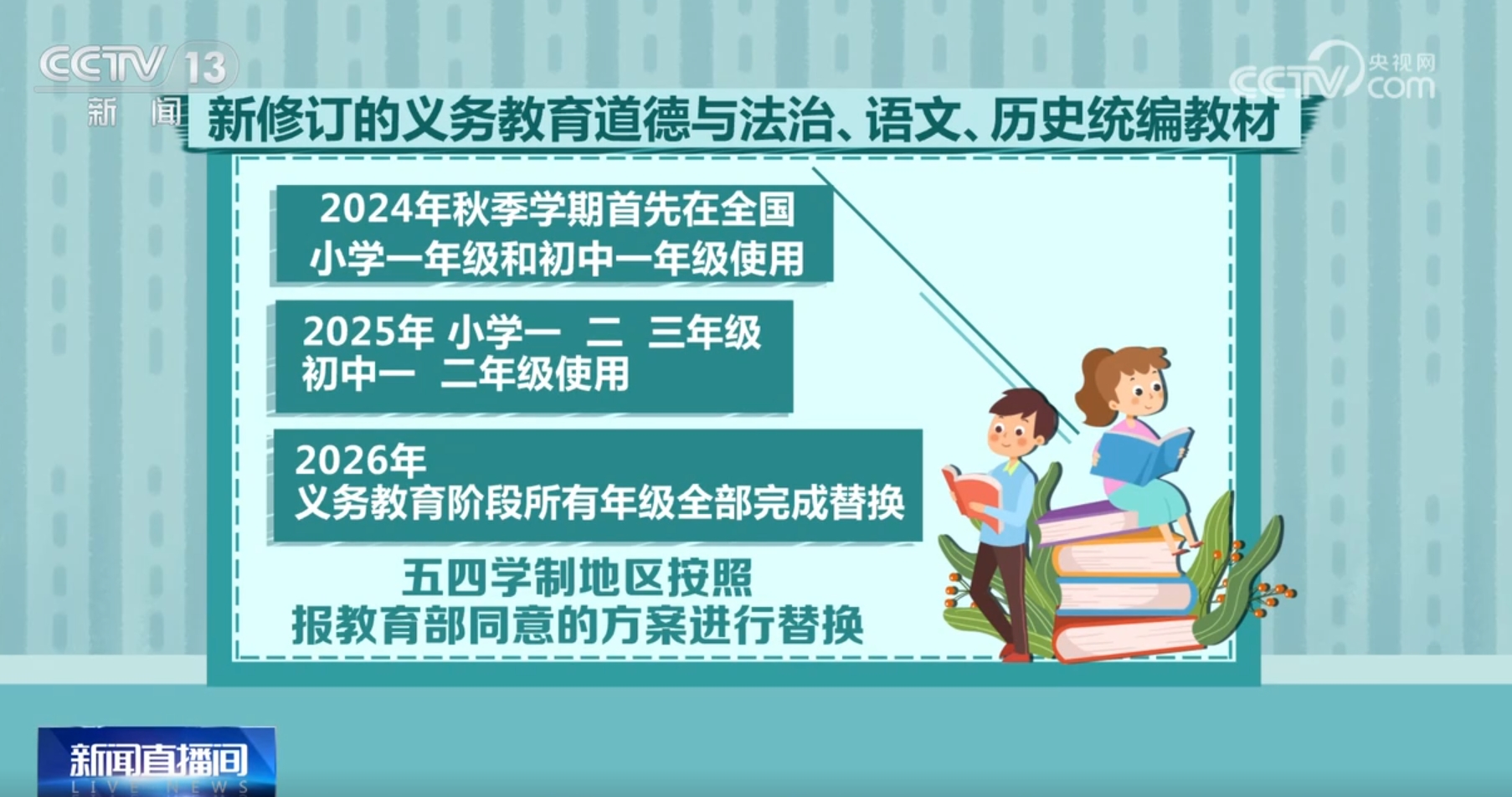 教育部教材局相关负责人介绍,这次义务教育统编教材的修订历时两年多时间,并经过550多所学校10万多名学生的试教试用,最终由国家教材委员会审核通过。2024年秋季学期首先在全国小学一年级和初中一年级使用,2025年,小学一、二、三年级和初中一、二年级使用,2026年,义务教育阶段所有年级全部完成替换,五四学制地区按照报教育部同意的方案进行替换。
