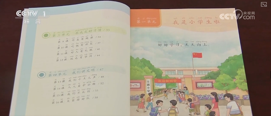 翻开新修订的《道德与法治》一年级上册,从校园生活切入,图文并茂地教刚入学的小学生如何礼貌待人、与同伴玩耍,还有升国旗、唱国歌这些仪式蕴含的知识与意义。