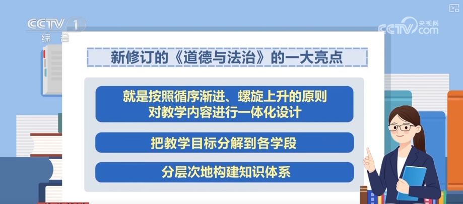 据介绍,新修订的《道德与法治》的一大亮点就是按照循序渐进、螺旋上升的原则对教学内容进行一体化设计。比如,此次新增的中华优秀传统文化主题单元,在小学阶段注重引导学生在日常生活中增进对传统文化的认识,初中阶段则引导学生进一步认识传统文化的博大精深。