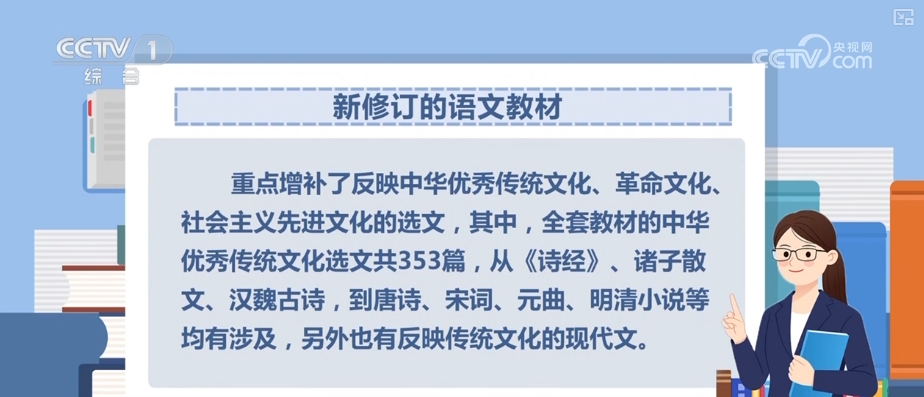义务教育语文教材编委会主任王立军介绍,新修订的语文教材重点增补了反映中华优秀传统文化、革命文化、社会主义先进文化的选文,其中,全套教材的中华优秀传统文化选文共353篇,从《诗经》、诸子散文、汉魏古诗到唐诗、宋词、元曲、明清小说等均有涉及。另外也有反映传统文化的现代文。