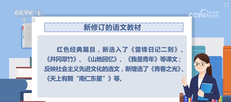 红色经典篇目新选入了《雷锋日记二则》《井冈翠竹》《山地回忆》《我是青年》等课文。反映社会主义先进文化的选文,新增选了《青春之光》《天上有颗“南仁东星”》等。