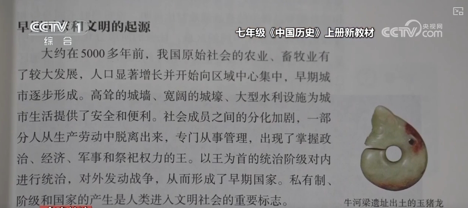 义务教育历史教材编委会主任张海鹏介绍,现在说的文明起源是根据考古发掘,5000年前的地下发掘物来重新研究、重新判断。来认识我们的先民是怎么推动生产力的发展,怎么样形成国家,这个是有根据的,这个跟传说不一样。