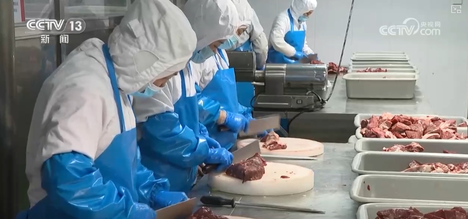 不仅线下消费火爆,通过线上直播和冷链全程运输,在当地的这家肉类加工厂内,工作人员穿串、切肉、封袋等一系列的操作一气呵成。2024年,厂区还增加了自动化机械设备,大大提升了工作效率,确保节日市场供应充足。目前,最远可以送达海南、云南等地方,2024年的销售量同比2023年增长了30%—40%。