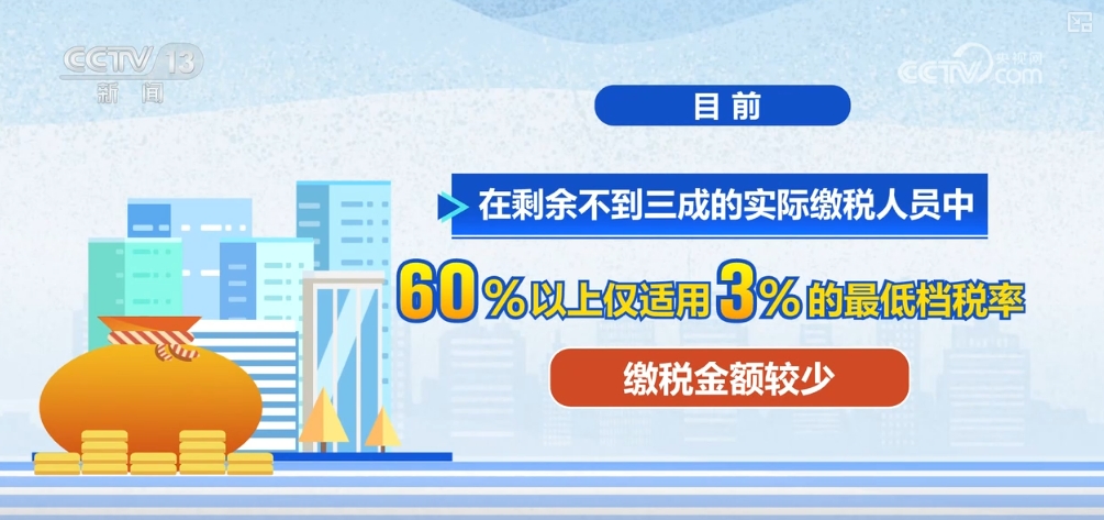 国家税务总局税收数据显示,目前,我国取得综合所得的人员中,无需缴纳个税的人员占比超过七成,在剩余不到三成的实际缴税人员中,60%以上仅适用3%的最低档税率,缴税金额较少。