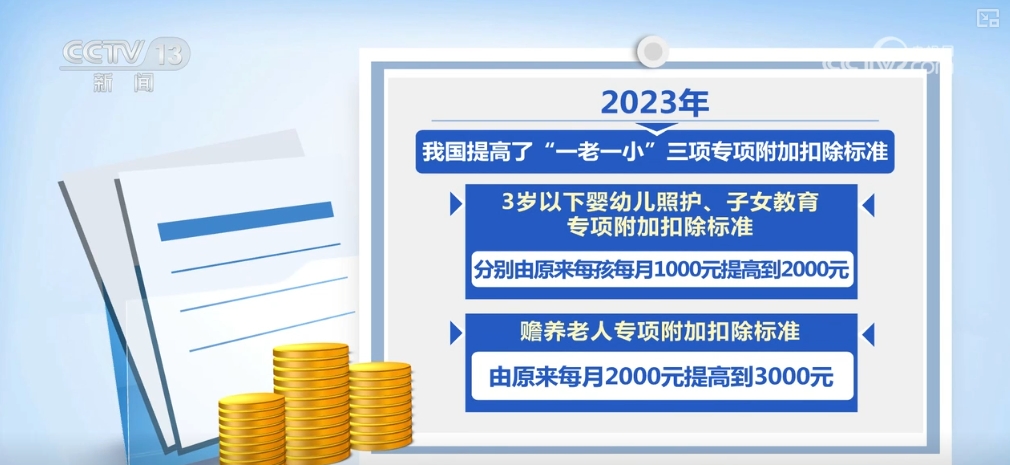 据介绍,2023年,我国提高了“一老一小”三项专项附加扣除标准。3岁以下婴幼儿照护、子女教育专项附加扣除标准,分别由原来每孩每月1000元提高到2000元,赡养老人专项附加扣除标准由原来每月2000元提高到3000元。